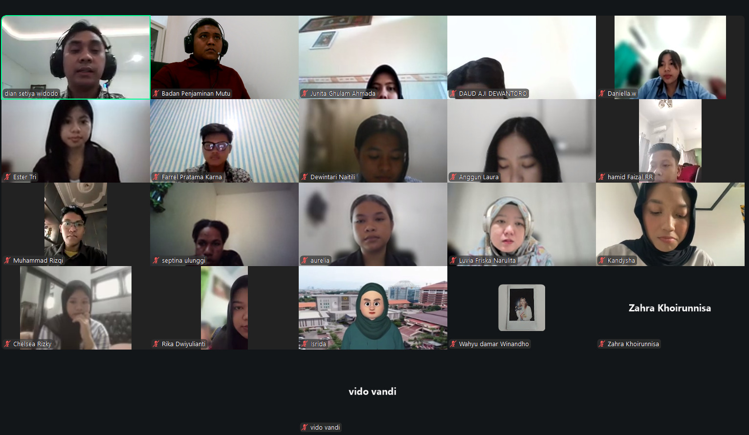 Pada hari kedua, Jumat (19/12/2025), kegiatan dilanjutkan dengan wawancara virtual via Zoom Meeting terhadap seluruh mahasiswa Prodi Sarjana Kedokteran. Sesi ini dipandu oleh Dr. Wiwik Afifah S.Pi., SH., MH., Dr. Isrida Yul Arifiana, M.Psi., Psikolog, dan Luvia Friska Narulita, S.ST., M.T., yang menggali pengalaman dan persepsi mahasiswa secara langsung terkait atmosfer akademik, efektivitas pembelajaran, ketersediaan sumber daya, serta sistem pendukung akademik.