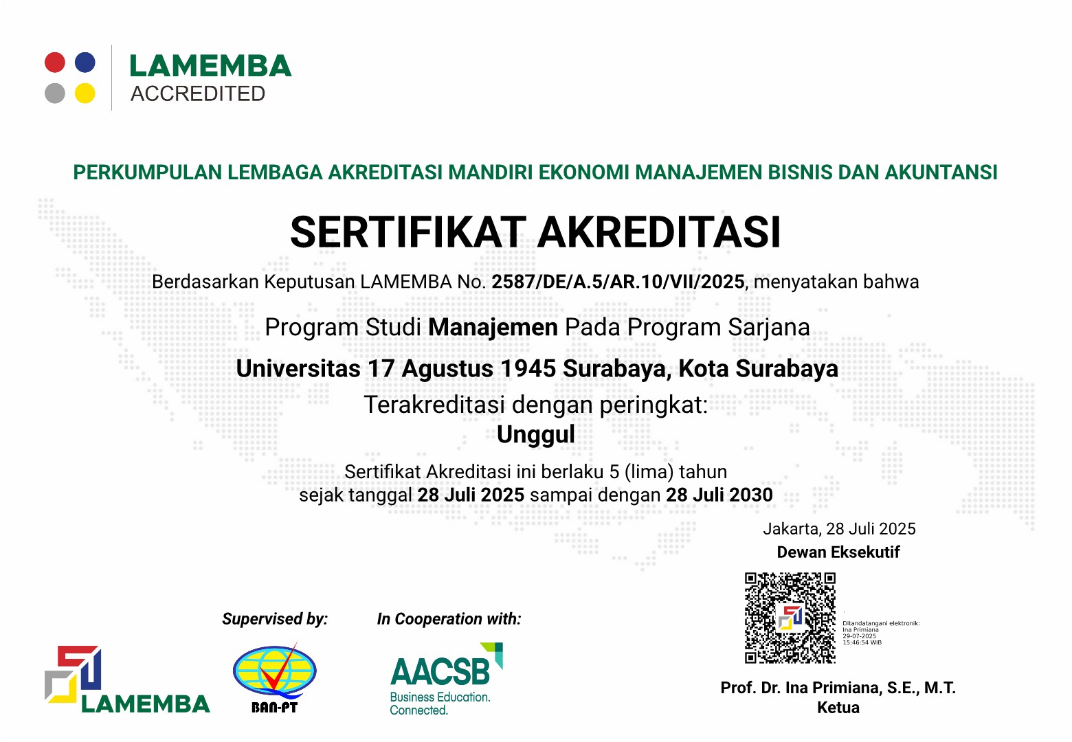 Selamat kepada Program Studi Manajemen Pada Program Sarjana Universitas 17 Agustus 1945 Surabaya telah Terakreditasi dengan peringkat Unggul dari LAMEMBA.